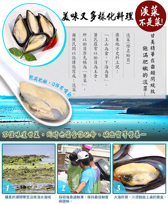 在大海中閃耀著光芒,如同黑曜石般奢華 ![]() ![]() 海鮮料理中,只有擁有淡菜相襯,看起來就更高貴奢華!淡菜飽滿肥嫩的模樣、入口的Q彈與豐富營養,將大海滋味毫無隱藏的釋放,如此奔放的鮮美享受,讓人不得不愛上! ![]() ![]() ![]() ![]() ![]() ![]() ![]() ![]() ![]() 商品說明 【買新鮮】淡菜 規格:800g±10%/包(25~28顆裝) 內容物成份:貽貝 添加物名稱:無 產地:中國 保存期限:一年 有效期限:標示於包裝上 投保產品責任險字號:1501字第04PD01321 ※本商品為天然作物,實品規格依實際收到貨品為準。 |